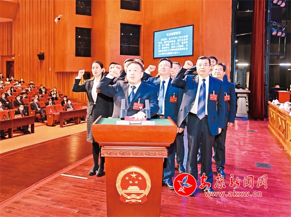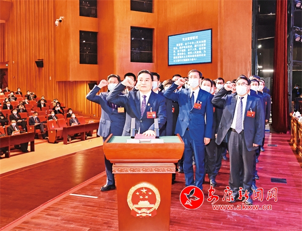 新當選的市級國家機關工作人員向憲法宣誓,新當選的市五屆人大常委會主任王彪、市人民政府市長武文罡分別領誓。