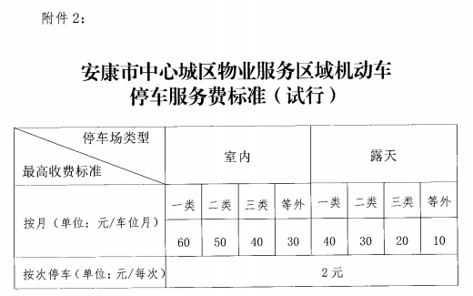 2、《安康市中心城區物業服務區域機動車停車服務費標準》(試行)。