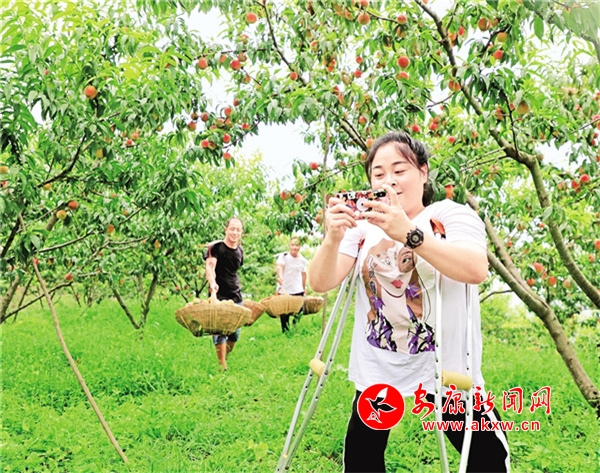 文化村七組,李丹桃園早已聲名遠(yuǎn)播,每年春秋時(shí)節(jié),來(lái)來(lái)往往的游客幾乎把田埂都要踏平。抓住契機(jī)的李丹,不僅通過(guò)直播賣桃攬客,還開(kāi)設(shè)了農(nóng)家樂(lè),打造出集生態(tài)觀光、果蔬采摘、餐飲住宿于一體的田園綜合體,為文化村帶來(lái)了人氣、盤活了地氣、聚攏了財(cái)氣。