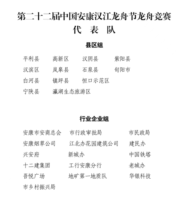 據悉,第22屆國安康漢江龍舟節龍舟競賽將于2022年6月3日至5日,在安康城區漢江一橋至漢江三橋江面舉行,屆時各代表隊會在萬眾矚目中劈波斬浪,一決高下。龍舟組隊包含縣區組13支、行業企業組16支,其中安康市安商總會、市行政審批局、中國鐵塔、工行安康分行、華銀科技、市鄉村振興局、地礦第一地質隊7支隊伍均為首次參加。本次競賽項目有3個,即400米上水、800米下水、800米折返追逐賽。比賽兩個組別分設團體獎和單項名次獎,其中團體獎各組設一等獎1名、二等獎1名、其余均為三等獎,單項名次獎分組別分項目各錄取前八名,根據成績名次按13、11、10、9、8、7、6、5計分,團體獎按照各單項獎積分總和排序,獲得各獎項的參賽隊均有相應獎勵。