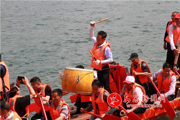 上午10時許,龍舟文化園禮炮轟鳴,數百健兒痛快地飲下“摔碗酒”,隨后依次登上自己隊伍的龍舟。紅色、黃色、紫色的龍舟整齊劃一地?吭诮,龍頭高昂,龍尾高翹,槳櫓浮動,旗幟飄揚。聞聲而來的群眾齊聚兩岸,駐足圍觀。總指揮一聲哨響,木槳齊動,龍舟似箭掠過無垠江面直逼江心,留下層層白浪;一艘艘或逆流勇進,或順流而下,或徑直橫渡,瞬間點燃觀眾激情,不時引得大家齊聲吶喊。號子聲、鑼鼓聲、吶喊聲、歡呼聲,此起彼伏,聲聲震天。隊員們跟隨著鼓點賣力地劃槳,舵手隨著龍舟行進的方向不停調整把舵,龍舟的速度不斷加快,再快,更快。