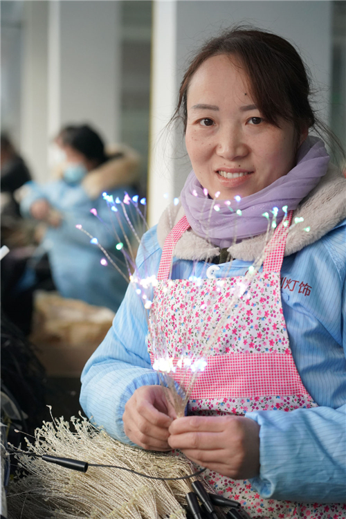 在安康市白河縣城關鎮(zhèn)安坪社區(qū)一家燈飾社區(qū)工廠內,工人馬友梅在展示制作的產品(2月22日攝)。新華社記者邵瑞攝