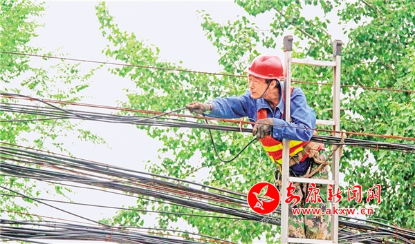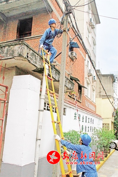 圖1、2、3:7月18日上午,在漢濱區大南街,國網安康供電公司漢濱供電分公司的工作人員正在對電網線路進行整治。 記者 張喬 攝