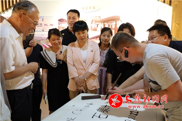 在石泉縣金蠶小鎮,外國記者朋友們先后深入鎏金銅蠶出土處和金蠶之鄉展覽館,現場探尋金蠶歷史,感受絲路文化。大家均被眼前燦爛悠久的蠶桑文化觸動,不禁發出贊嘆:絲綢之路真偉大!參觀結束,各路記者們久久不愿離去,連連用毛筆在紙上為這片土地留下不同語言的祝福。來自白俄羅斯國家廣播電視公司的安東·瓦休凱維奇甚至用流暢的中文寫下——“石泉十美”,以表達對“絲路源點”省的熱愛。阿曼觀點報記者費薩爾·賽義德·穆罕默德·阿爾薩迪則用阿拉伯語寫下:“絲綢之路將我們連接在一起!”他寫完后意味深長地表示:“來到展覽館之后,我更加深刻地認識到,絲綢之路是將阿拉伯人和阿拉伯歷史跟中國歷史連接在一起的重要橋梁。”
