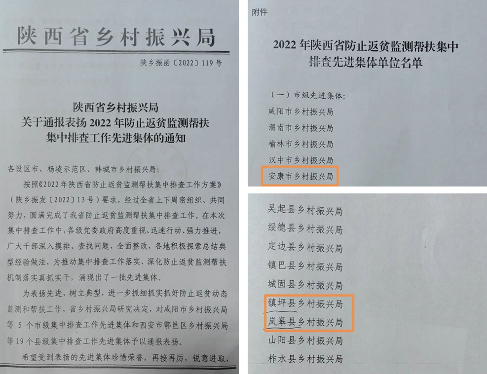 在8月5日陜西省鄉(xiāng)村振興局《關(guān)于通報表揚(yáng)2022年防止返貧監(jiān)測幫扶集中排查工作先進(jìn)集體的通知》中,我市鄉(xiāng)村振興局和嵐皋、鎮(zhèn)坪鄉(xiāng)村振興局獲得先進(jìn)集體的通報表揚(yáng)。