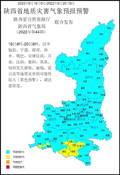 陜西省自然資源廳與陜西省氣象局聯合發布地質災害氣象預報預警:預計2022年9月19日8時至2022年9月20日8時,漢中勉縣、寧強、南鄭、西鄉、鎮巴,安康漢濱、石泉、漢陰、紫陽、嵐皋、旬陽發生滑坡、崩塌、泥石流等地質災害的可能性較大(黃色預警),請注意防范。