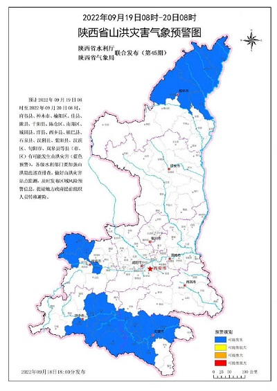 陜西省水利廳與陜西省氣象局聯合發布山洪災害氣象預警:預計2022年09月19日08時至2022年09月20日08時,府谷縣、神木市、榆陽區、佳縣、隴縣、千陽縣、陳倉區、南鄭區、城固縣、洋縣、西鄉縣、鎮巴縣、石泉縣、漢陰縣、紫陽縣、漢濱區、旬陽市、嵐皋縣等縣(市、區)有可能發生山洪災害(藍色預警)。各級水利部門要加強山洪隱患巡查排查,做好山洪災害站點監測,及時發布區域風險預警信息,提請地方政府提前組織人員轉移避險。