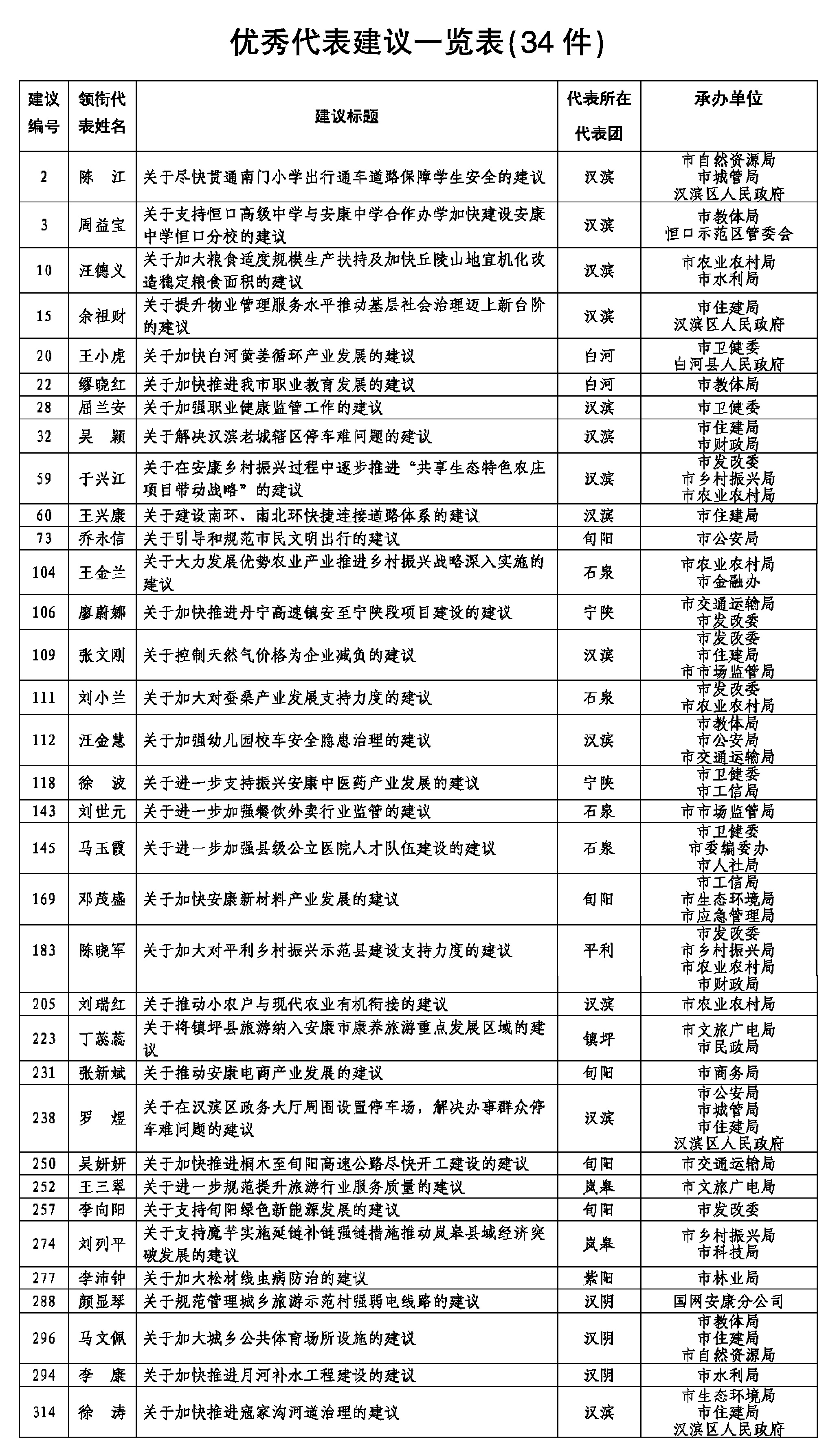 市人大代表向市級國家機關提出建議、批評和意見,是憲法和法律賦予的民主權利,是代表人民直接參與管理國家和社會事務的有效形式。市五屆人大一次會議以來,全體市人大代表深入學習貫徹習近平新時代中國特色社會主義思想和黨的二十大及中央人大工作會議精神,緊緊圍繞全市中心工作和人民群眾普遍關心關注的熱點難點問題,依法履行職責,積極建言獻策,共提出了321件代表建議,為推進安康經濟社會發展和民主法治建設凝聚了智慧、增進了共識、貢獻了力量。為樹立典型、推進工作,市人大常委會決定,對陳江等代表提出的34件優秀代表建議予以通報表揚。