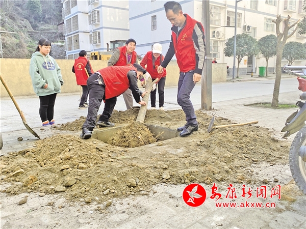 紫陽縣高橋鎮桂花樹社區黨支部開展“傳承雷鋒精神,爭做綠色使者”主題黨日活動,黨員們共植樹300余棵,進一步美化了社區環境。 李放 王順勤 攝
