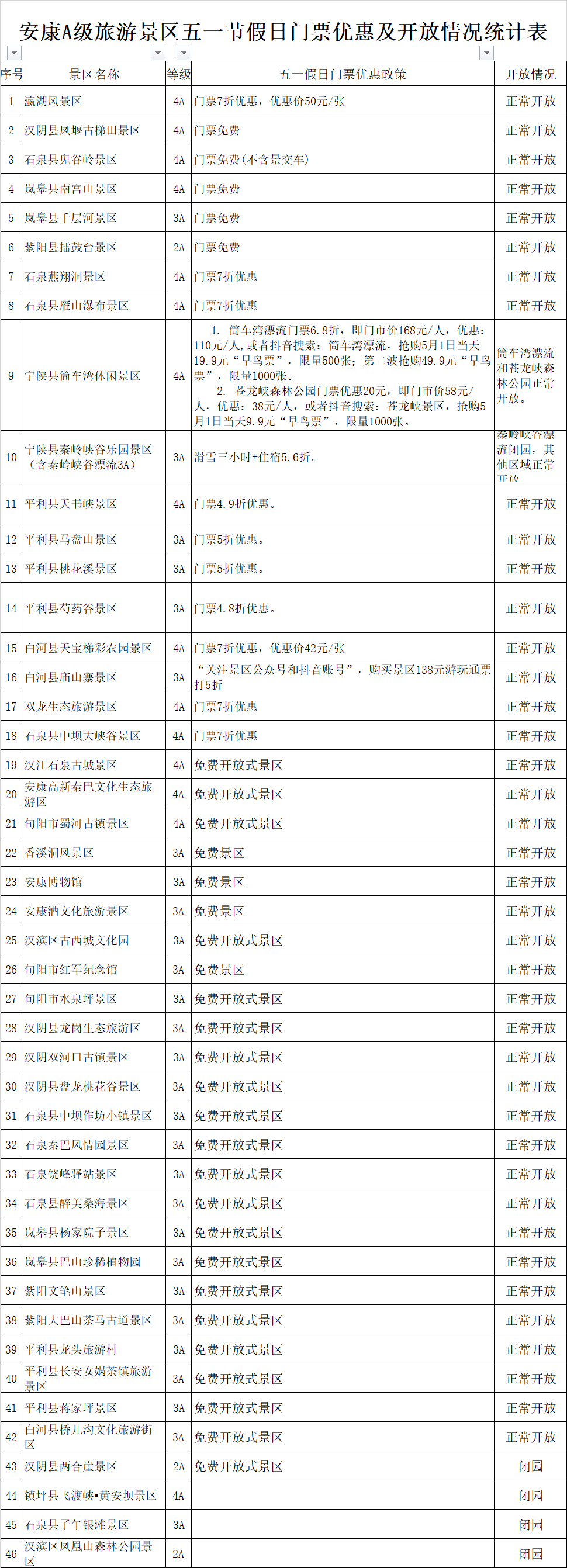 24家不收門票的開放式景區(漢江石泉古城景區、安康高新秦巴文化生態旅游區、旬陽市蜀河古鎮景區、香溪洞風景區、安康博物館、安康酒文化旅游景區、漢濱區古西城文化園、旬陽市紅軍紀念館、旬陽市水泉坪景區、漢陰縣龍崗生態旅游區、漢陰雙河口古鎮景區、漢陰縣盤龍桃花谷景區 、石泉縣中壩作坊小鎮景區、石泉秦巴風情園景區、石泉饒峰驛站景區、石泉縣醉美桑海景區、嵐皋縣楊家院子景區、嵐皋縣巴山珍稀植物園、紫陽文筆山景區、紫陽大巴山茶馬古道景區、平利縣龍頭旅游村、平利縣長安女媧茶鎮旅游景區、平利縣蔣家坪景區、白河縣橋兒溝文化旅游街區)。GMn安康新聞網