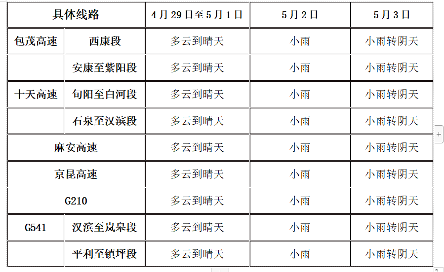 “五一”前期,前期天氣相對適宜出行,后期受降水天氣影響,包茂高速、麻安高速、十天高速、G541等路段需注意低能見度及道路濕滑對交通安全的不利影響,出行注意安全,另外返程期間可能出現交通擁堵,出行需提前規劃好路線以免受到影響。