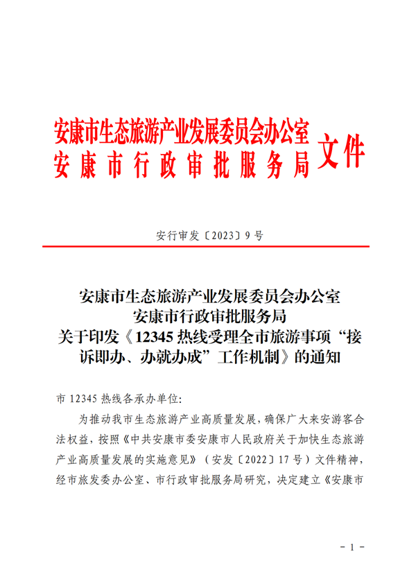 為推動我市生態旅游產業高質量發展,確保廣大來安游客合法權益,按照《中共安康市委安康市人民政府關于加快生態旅游產業高質量發展的實施意見》(安發〔2022〕17號)文件精神,經市旅發委辦公室、市行政審批服務局研究,決定建立《安康市12345熱線受理全市旅游事項“接訴即辦、辦就辦成”工作機制》,請認真抓好貫徹落實。