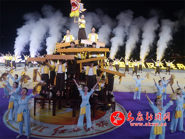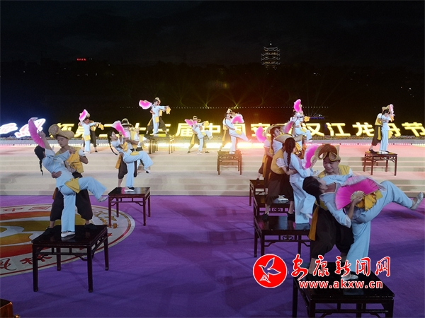熠熠燈輝“靚”漢江,南北歌舞“響”安康。演出活動以絢麗奪目的燈光秀《華彩漢江》開場,漢江兩岸五光十色的燈光隨著音樂的節(jié)律不斷變換、舞動,使一江兩岸美輪美奐,《安安康康鬧龍舟》通過“毛絨玩具”的親切問候和載歌載舞,展現(xiàn)了安康新毛絨玩具產(chǎn)業(yè)蓬勃發(fā)展的動力和生機,具有地方特色的民族舞蹈《方寸之間》,將安康的傳統(tǒng)藝術(shù)與時代特色緊密結(jié)合,舞出了了安康人民在新時代表現(xiàn)出的新風(fēng)貌,原汁原味的陜南陜北民歌對唱,讓粗狂和婉約在漢水之濱進(jìn)行完美約會,歌舞、獨唱、漢劇、雜技《南木有禾》《荷韻漢江》《節(jié)日歡歌》《魅力安康》《環(huán)之舞》《端午安康》等節(jié)目,以獨特的唱腔、曼妙的舞姿和獨特的技藝全方位的展現(xiàn)了漢水傳統(tǒng)文化的魅力和安康人民的精神追求,熱情激昂的歌舞《端午安康》演繹出了漢水兒女對聚力建設(shè)幸福安康的美好祝愿和對未來幸福美好生活的向往。