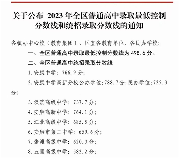 7月13日,漢濱區(qū)教育體育局、高新區(qū)教育體育局、恒口示范區(qū)教育體育局聯(lián)合發(fā)布《關(guān)于公布2023年全區(qū)普通高中錄取最低控制分數(shù)線和統(tǒng)招錄取分數(shù)線的通知》:M6n安康新聞網(wǎng)