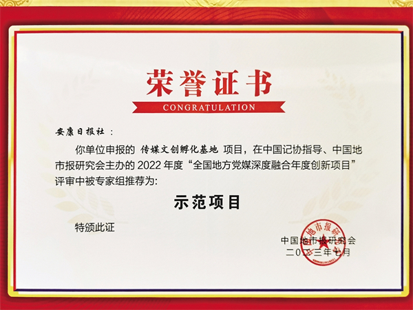7月9日,全國地市媒體全媒體傳播體系建設推進大會在內蒙古烏蘭浩特市舉行。會上,對第二屆全國地方黨媒融合發展創新項目進行了表彰,安康日報社的《傳媒文創孵化基地》獲“示范項目”大獎,此獎項陜西共兩家媒體通過評審獲獎。