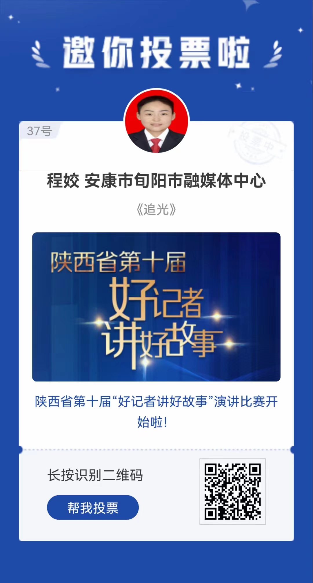 陜西省第十屆“好記者講好故事”活動決賽開幕在即。7月26日,陜西省新聞工作者協會開通投票通道,由我市推薦的旬陽市融媒體中心程姣(故事作品《追光》)順利入圍。