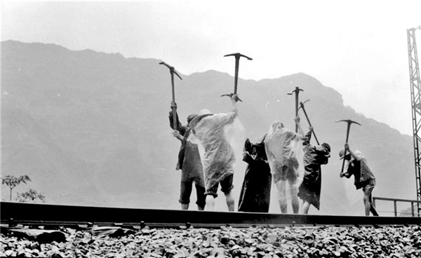 這里在大巴山深處,找不到三尺平地,無法安置站臺,鐵道兵就把站臺修在橋面上。車站值班室是間磚房,一張桌子,兩張椅子,兩個值班員,一正一副。充當站臺的橋面上鋪了三股鋼軌,一股供臨時停車用,另兩股通往山外。站臺對面是山,筆陡如削,巖石如鐵,透溢著拒人千里的冷色。