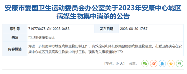 安康市愛國衛生運動委員會辦公室關于2023年安康中心城區病媒生物集中消殺的公告D8F安康新聞網