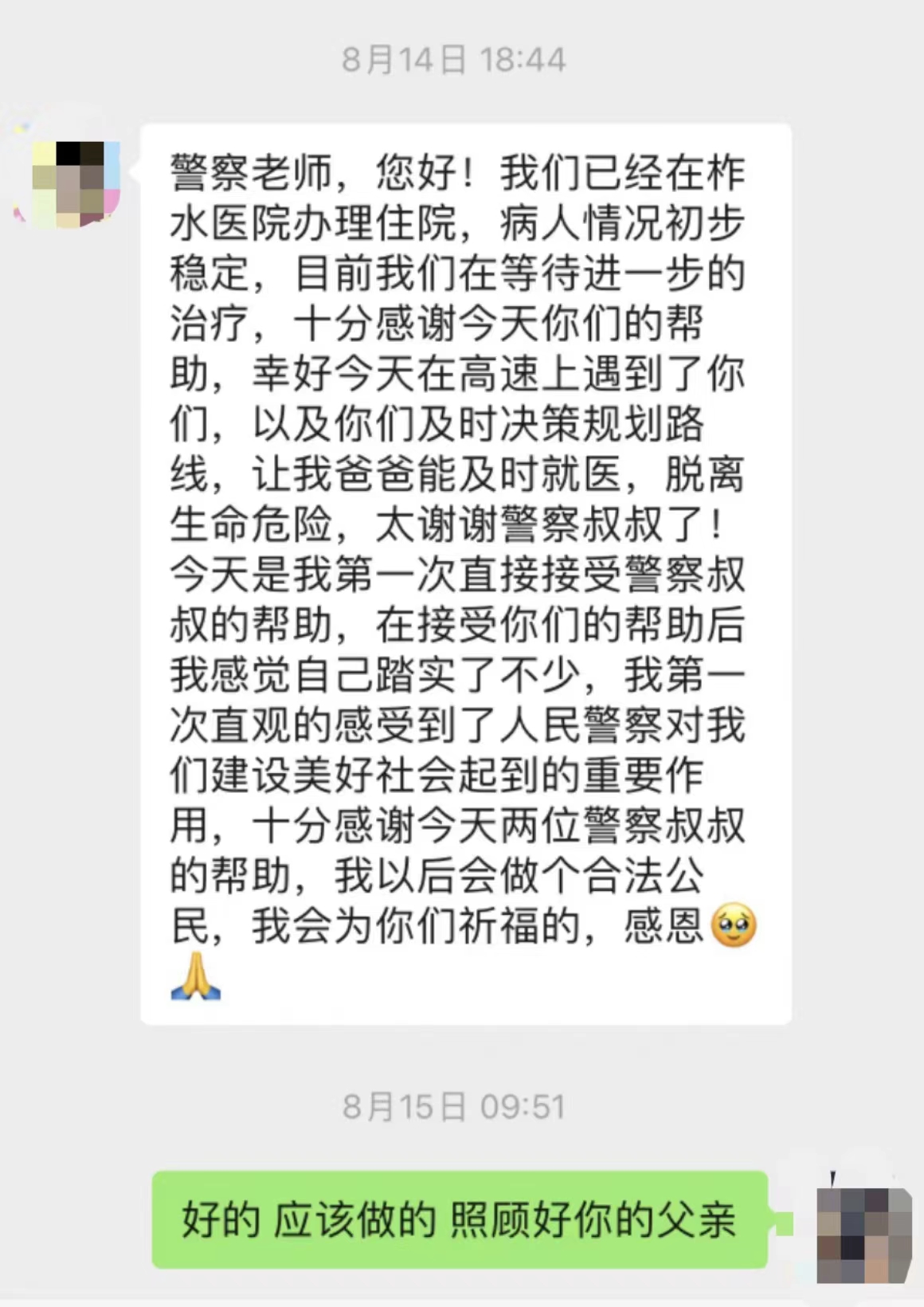 “警察叔叔您好,我們已經(jīng)在醫(yī)院辦理住院,我父親情況初步穩(wěn)定,目前在等待進(jìn)一步的治療。十分感謝你們的幫助……” 8月14日,安康鐵路運(yùn)輸法院司法干警胡儉收到了這樣一條感謝微信。