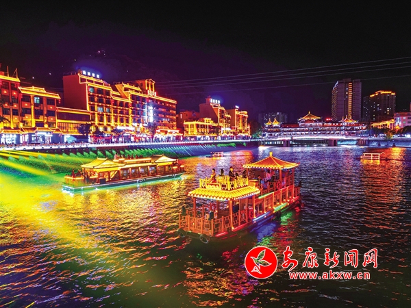 賽場內氣氛熱烈,激情昂揚;賽場外活動多樣,異常精彩。賽事期間,嵐皋化身“不夜城”,琉璃燈火,璀璨夜色。每天傍晚,嵐皋“硒旺”號畫舫乘著晚風從碼頭緩緩出發,在燈光輝映下流光溢彩,船上輕歌曼舞,為槳聲燈影里的嵐河平添了一道水上流動風景。嵐河兩岸紛紛開展各具特色的文旅活動,“嵐河夜畫”燈光秀把縣城裝扮得斑斕夢幻,花燈祈福、龍舟競渡等水上項目供游客參與體驗,cosplay、漢服、西游等主題巡游,處處飄蕩著歡聲笑語,各地游客在欣賞賽事的同時,享受到更多豐富多彩的娛樂生活。拍照、直播、發朋友圈,據不完全統計,賽事及相關活動吸引860余萬網民圍觀。