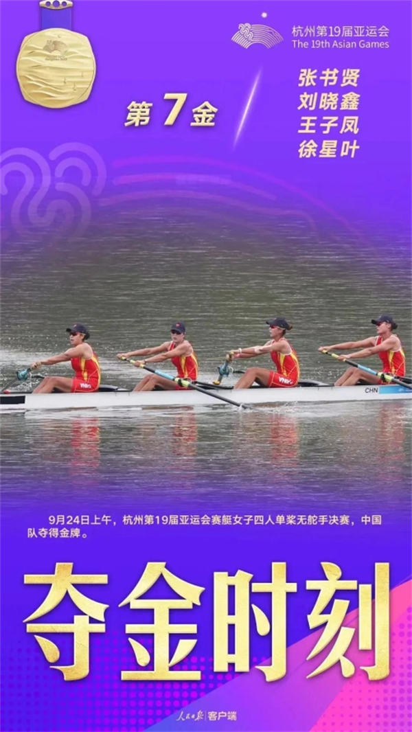 9月24日上午,在杭州亞運會賽艇女子4人單槳無舵手決賽中,中國組合張書賢、劉曉鑫、王子鳳、徐星葉獲得金牌,其中徐星葉來自陜西安康,這是陜西運動員在本屆亞運會獲得的首枚金牌。yZ6安康新聞網