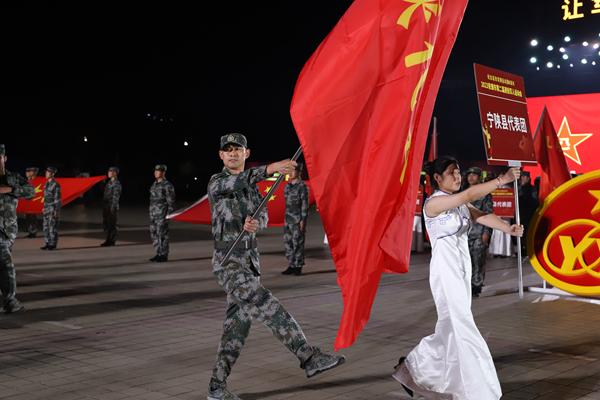入場儀式完畢,全場起立,面向國旗,共同高唱國歌。伴隨著高亢雄壯的國歌聲,五星紅旗冉冉升起。在國旗下,全體退役軍人高舉右拳莊嚴宣誓,表達了退伍軍人堅定不移聽黨話、跟黨走的決心和意志。