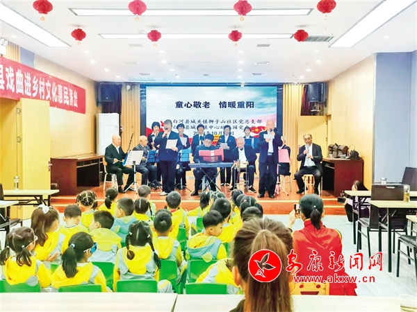 白河縣獅子山社區聯合城關鎮中心幼兒園舉辦“童心敬老情暖重陽”主題活動。黃秀琴 攝