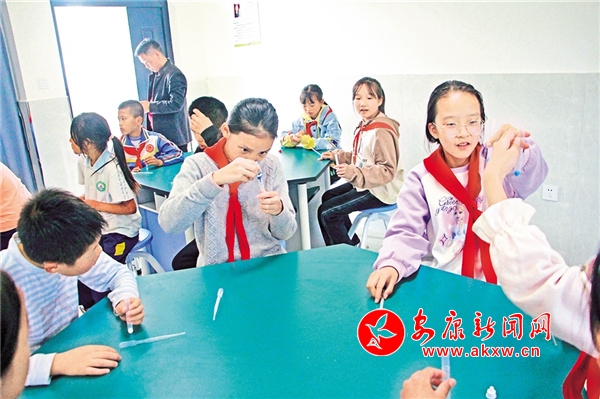 老縣鎮(zhèn)中心小學(xué)學(xué)生動(dòng)手體驗(yàn)酸堿中和實(shí)驗(yàn)。 吳風(fēng)軍 攝