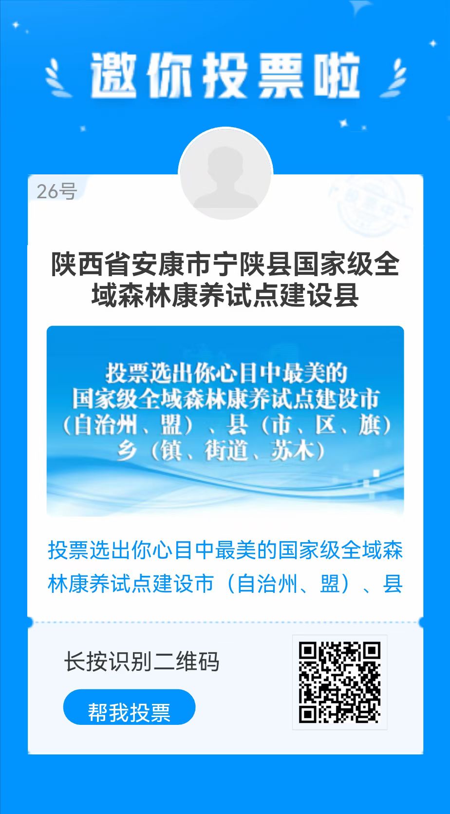 據了解,國家級森林康養試點建設單位認定工作由中國林業產業聯合會負責開展,經自愿申報、主管部門審核推薦、合規用地和安全經營專項檢查、當地公示、專家審查及認定結果全國公示等程序,確定了2023年國家級森林康養試點建設單位名單。同時還開設投票活動,選出大眾心目中最美的國家級森林康養試點建設基地和中國森林康養人家,請為森林履蓋率全國第一的“秦嶺之心 綠都寧陜”投上您寶貴的3票!(長按二維碼即可投票,每個微信號每天可投3票)