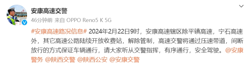 2月22日9時,安康高速交警發布通知:安康高速轄區除平鎮高速,寧石高速外,其它高速公路陸續開放收費站,解除管制,高速交警將通過壓速帶道,間斷放行的方式保證車輛通行。LPW安康新聞網