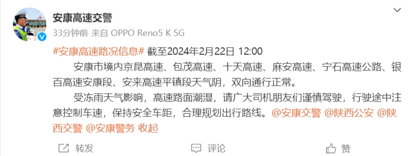據(jù)安康高速交警消息:截至2024年2月22日12:00,安康市境內(nèi)京昆高速、包茂高速、十天高速、麻安高速、寧石高速公路、銀百高速安康段、安來高速平鎮(zhèn)段天氣陰,雙向通行正常。受凍雨天氣影響,高速路面潮濕,請廣大司機朋友們謹(jǐn)慎駕駛,行駛途中注意控制車速,保持安全車距,合理規(guī)劃出行路線。 hKJ安康新聞網(wǎng)