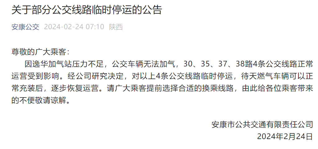 2月24日7時,市公交公司發布通知:因逸華加氣站壓力不足,公交車輛無法加氣,30、35、37、38路4條公交線路正常運營受到影響。經公司研究決定,對以上4條公交線路臨時停運,待天燃氣車輛可以正常充裝后,逐步恢復運營。2nF安康新聞網