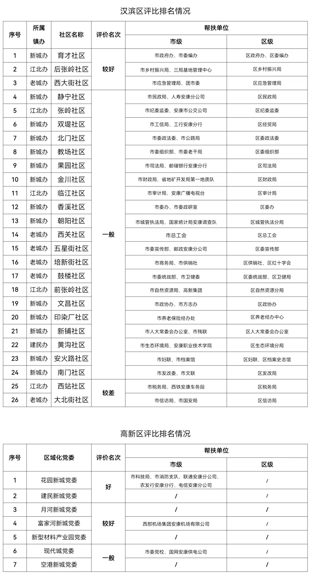 按照市創文辦《關于扎實開展全域評比排名工作的通知》(安創文辦發〔2023〕2號)要求,近期,漢濱區、高新區組織對各鎮辦、區域化黨委、社區(村)、托管村創文階段性工作成效進行了評比排名,現將結果通報如下:XmL安康新聞網