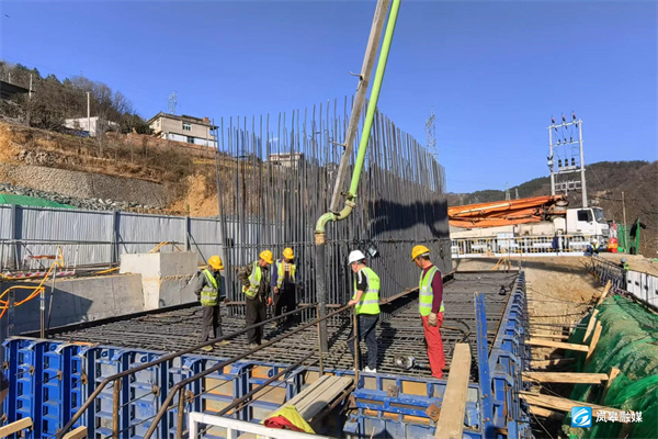 “對施工現場承臺尺寸測量和檢查,確保承臺的尺寸和位置準確無誤。隨后按照設計圖紙及規范要求綁扎承臺鋼筋,布設降溫管,埋設墩身預埋鋼筋,定型鋼模板安裝加固,以確保承臺的強度和穩定性。”現場技術員高敬智說道。施工中,參建單位嚴格落實安全質量技術交底,優化施工配置,項目技術人員全程盯控,按標準化施工要求分層澆筑、振搗、下料,確保混凝土澆筑順利進行。