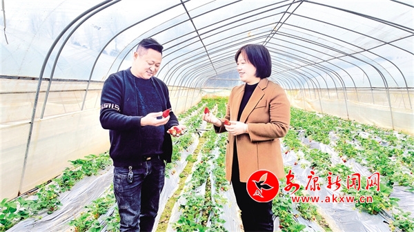 雙乳鎮黨委書記柳楊(右)走進草莓園