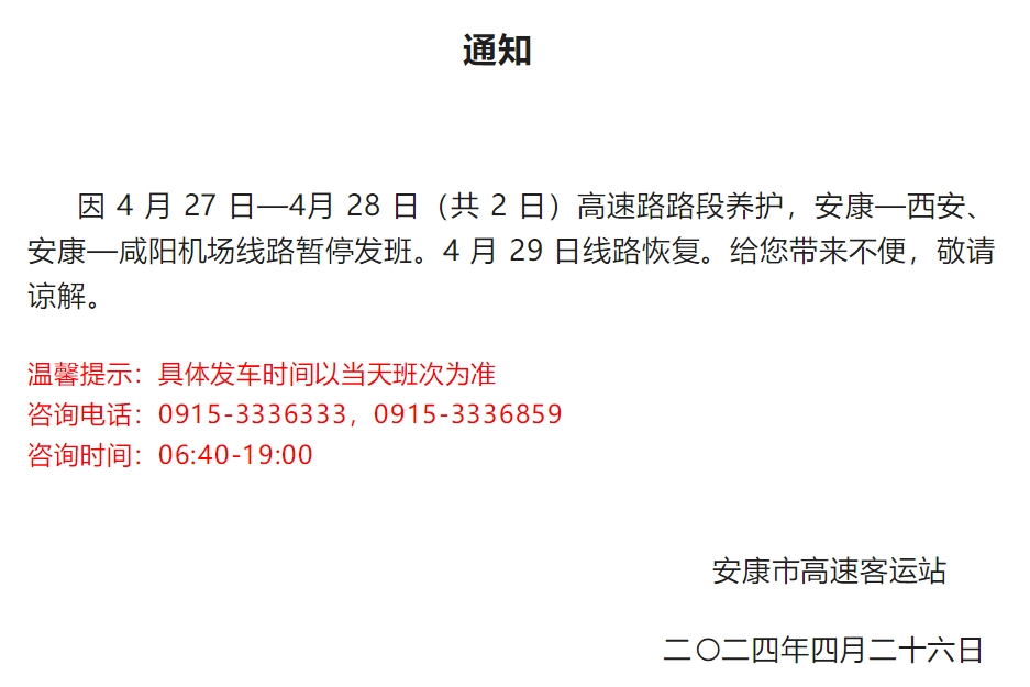 本周末 安康至西安、咸陽機場高速客運暫停發班