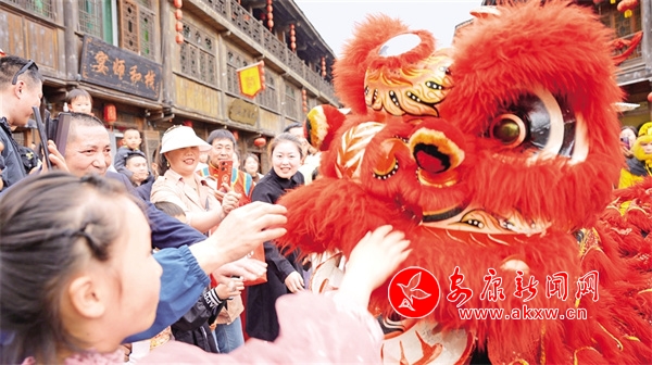 “五一”小長假期間,漢陰縣雙河口古鎮景區吸引了大批游客前來游玩打卡。圖為游人欣賞舞獅表演。王建霞 攝ekf安康新聞網