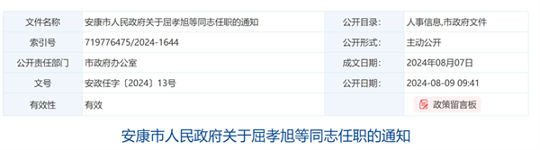 安康市人民政府關于屈孝旭等同志任職的通知