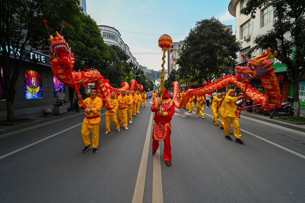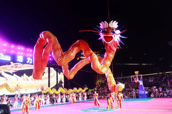 開幕式規(guī)模宏大,異常精彩。貴州廣播電視臺知名節(jié)目主持人、貴州村BA節(jié)目主持人李旭涵、劉子豪兩位重量級主持人親臨主持,熟練專業(yè)而又激情的引導(dǎo)互動為開幕式晚會增添爆棚氛圍。歌手沙寶亮傾情演唱《最初的信仰》《又回首》《暗香》等歌曲,世界散打冠軍、國家散打隊主教練許家恒,全國競走冠軍陳珍、全國青運會冠軍田紫丹的互動以及本土節(jié)目《旗開得勝》《歡迎你到嵐皋來》《巴山魔芋情》等將嵐皋豐厚的旅游資源、特色產(chǎn)品、人文風(fēng)情展現(xiàn)得淋漓盡致。無比酷炫的燈光秀、煙花秀閃耀全場,56米巨龍騰空而起,光與影的交織變換構(gòu)成了一幅幅絕妙畫卷,現(xiàn)場掌聲雷動,喝彩聲、吶喊聲此起彼伏。