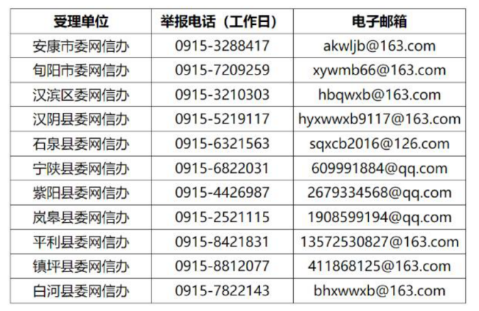 專項行動期間,歡迎廣大網民積極舉報我市范圍內相關違法違規行為,并提供線索或證據。網信部門將對舉報人個人信息嚴格保密,依法保護舉報人合法權益。舉報方式如下:RFz安康新聞網