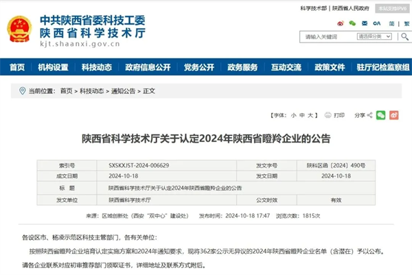 10月18日,陜西省科學(xué)技術(shù)廳公布了2024年度陜西省瞪羚企業(yè)名單,經(jīng)過層層篩選和嚴(yán)格評審,安康大數(shù)據(jù)公司成功入選“陜西省瞪羚企業(yè)”榜單。