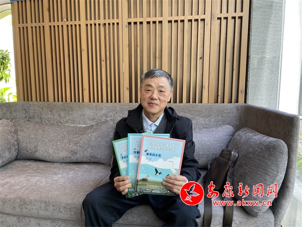 在瀛湖翠屏島上,采訪團采訪了退休教師林俊禮。林俊禮今年70歲。他從2015年開始用相機記錄調(diào)查漢江陜西段動植物,依據(jù)一手資料編寫了國家南水中線水源地生態(tài)科普三部曲《神奇的水鳥》《可愛的魚類》《多彩的水生植物》,來宣傳漢江陜西段美好生態(tài)資源。