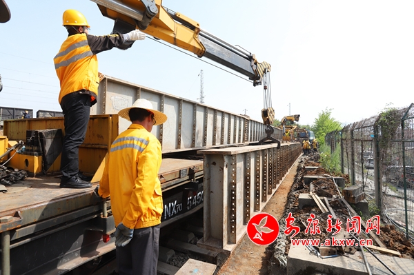 本網訊 (記者 魏濤)4月15日14時,經過4個小時的緊張施工,安康城區環城干道江北段建設工程(簡稱北環線)下穿安康東站V場通道工程首條股道D便梁架設順利完成,……