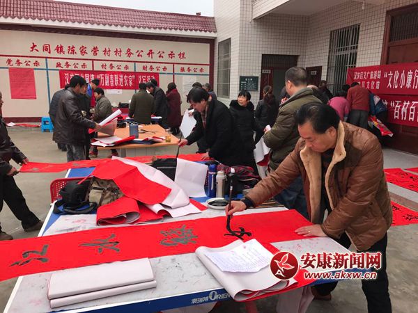 安康新聞網訊(通訊員 劉瀟 楊峰)1月8日,大同鎮陳家營村熱鬧非凡。2017年“萬副春聯進農家”活動在這里舉行,在寒冬臘月里為全鎮人民帶來了濃濃暖意。春聯書寫……