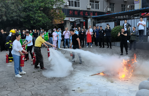 15:30分,演練警報拉響,模擬四樓會議室突發火災,室內和樓道產生大量煙霧,情況十分危急;鹁偷拿睿飿I公司立即啟動消防應急預案,安全負責人組織應急保安隊伍,緊急有序進行自救及疏散被困人員,控制火勢。在人員疏散搶救完畢后,通過滅火器和消火栓出水滅火方式,“大火”被成功撲滅。