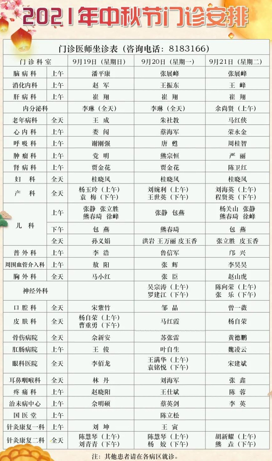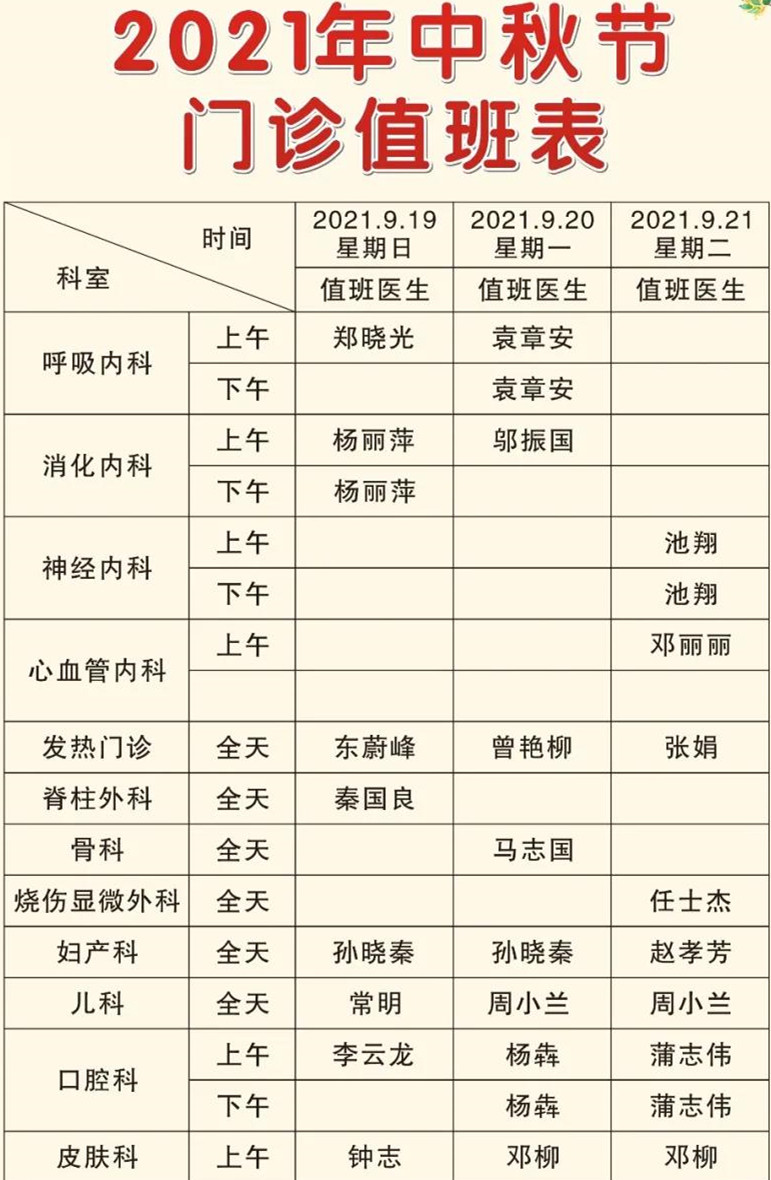 經(jīng)醫(yī)院研究決定,9月19日(星期日)至21日(星期二)中秋節(jié)放假調(diào)休3天,9月18日(星期六)正常上班,執(zhí)行周一門診排班。