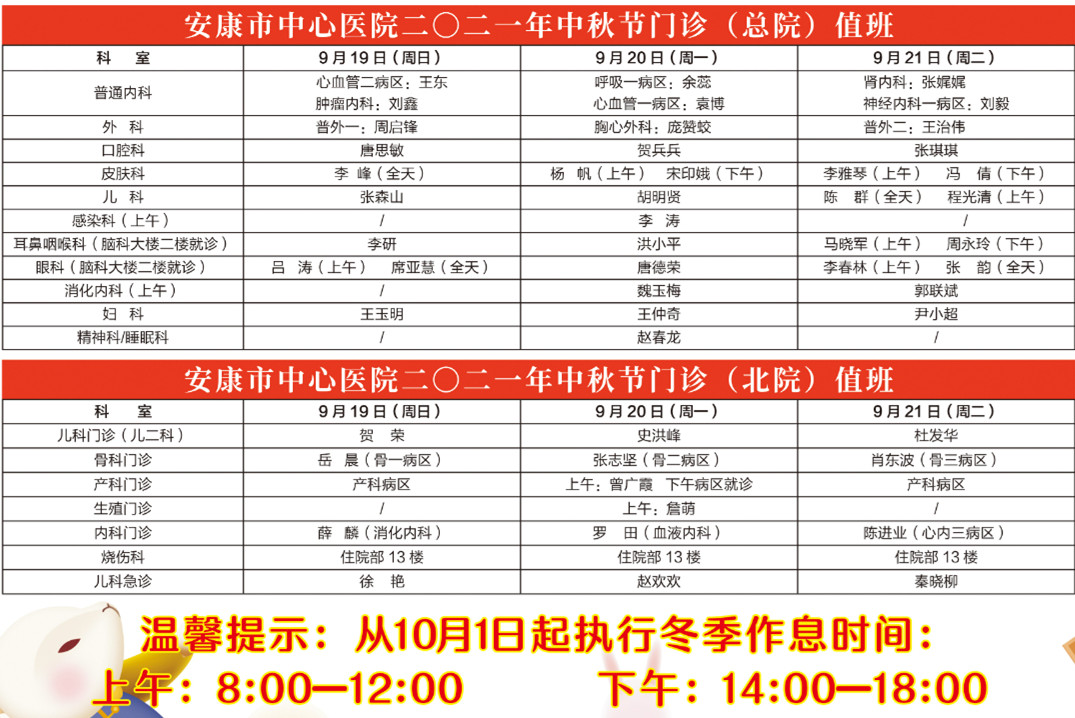 本網(wǎng)訊(通訊員 黃申奧)2021年農(nóng)歷中秋佳節(jié)將至,為保障人民群眾身體健康,方便群眾節(jié)假日期間就醫(yī)就診,安康市中心醫(yī)院、安康市人民醫(yī)院、安康市中醫(yī)醫(yī)院等陸續(xù)發(fā)布中秋假期放假通知及門診排班安排。
