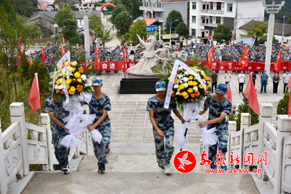 在戰斗紀念碑前,大家集體默哀,并向烈士敬獻花籃。講解員生動講述著牛蹄嶺的戰斗事跡,在場的每一位仿佛回到了那個戰火紛飛的年代,真切感受到革命先烈不怕犧牲、甘于奉獻的紅色精神。隨后,校黨總支副書記徐信濤作了題為“賡續紅色基因,肩負祖國未來”的報告。徐書記從18歲烈士陳祥榕以身護國講到東京奧運會上14歲少女全紅嬋為國爭光,再到習近平總書記來陜考察對青年學生的深切寄語,希望同學們在高中新起點上,扣好人生的“第一粒扣子”,立大志,明大德,成大才,擔大任,以自己的優異成績告慰革命先烈,以自己的優異表現實現強國夢想。接著,在高一年級郭紅梅老師的帶領下,全體學生面對紀念碑莊嚴宣誓,錚錚誓言,清澈響亮,無不透露出新時代少年報效祖國的堅定信心。