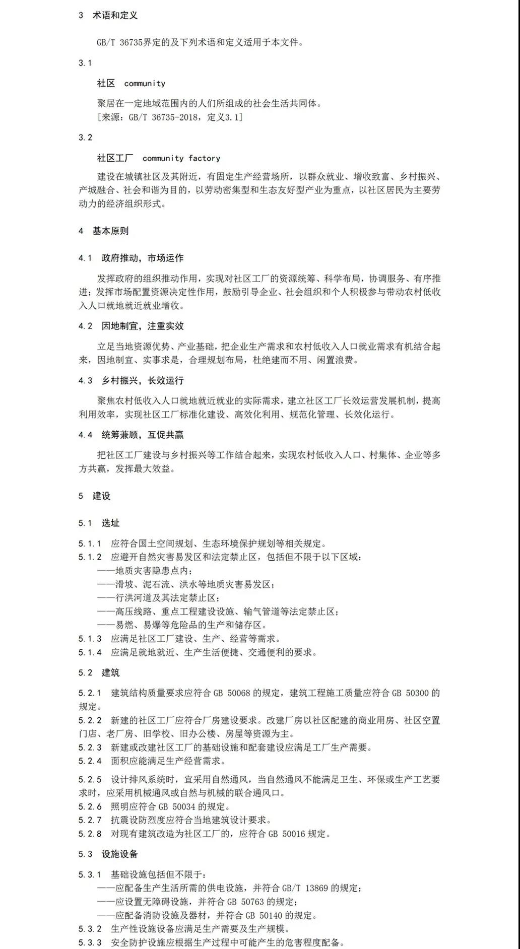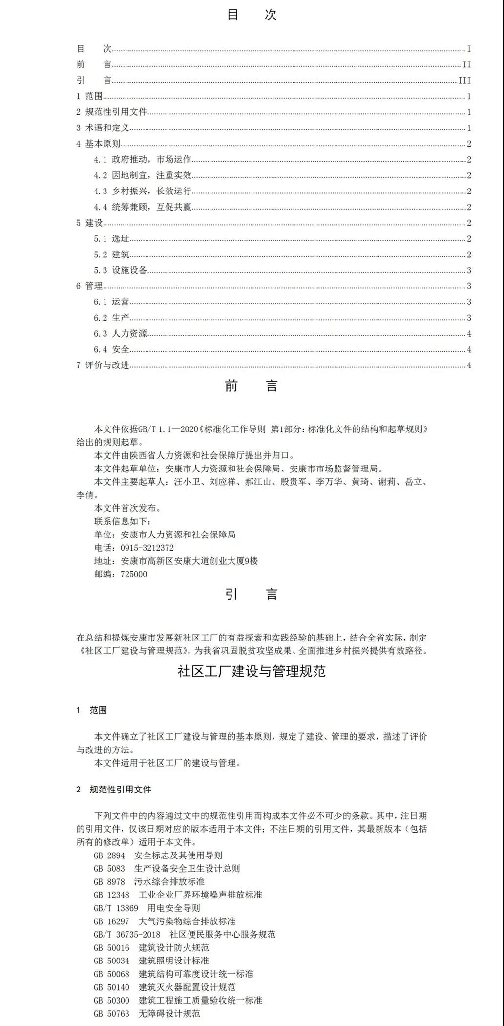 2020年6月,安康市人社局申請陜西省地方標準的立項,同年7月,陜西省市場監督管理局批準同意該標準制定。安康市人社局聯合安康市市場監督管理局共同成立標準起草組,形成標準草案。歷時兩年時間在全省范圍內實地調研,通過書面征求意見,反復修訂完善,專家評議審查等程序,最終形成報批稿。該標準分別從范圍、規范性引用文件、術語與定義、基本原則、建設、管理、評價與改進等七方面對社區工廠的建設與管理予以規范明確。