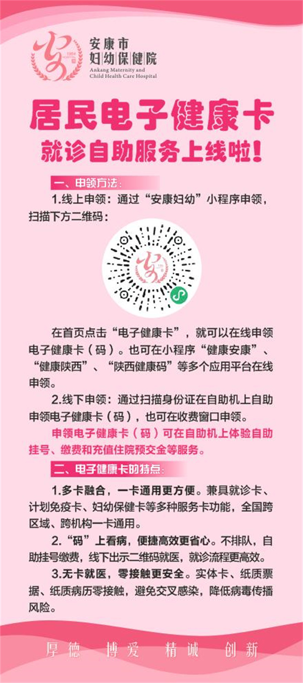 安康市婦幼保健院在醫(yī)院門(mén)診一樓大廳配備了智能醫(yī)療掛號(hào)繳費(fèi)終端,并在上線(xiàn)前期,組織了相關(guān)醫(yī)護(hù)人員開(kāi)展操作培訓(xùn)及就診人員門(mén)診自助就診演練,同時(shí)設(shè)立電子健康卡優(yōu)質(zhì)服務(wù)導(dǎo)醫(yī)服務(wù)臺(tái)進(jìn)行推廣,引導(dǎo)就診人員使用電子健康卡(碼),并廣泛征求或收集群眾建議意見(jiàn),不斷優(yōu)化電子健康卡(碼)操作流程。就診人員持二代身份證,在醫(yī)院智能醫(yī)療掛號(hào)繳費(fèi)終端、掛號(hào)窗口可申領(lǐng)紙質(zhì)健康卡(碼),也可在“安康婦幼”、“健康陜西”、“健康安康”和“陜西健康碼”等多個(gè)微信小程序應(yīng)用平臺(tái)中線(xiàn)上申領(lǐng)電子健康卡(碼),并可實(shí)現(xiàn)線(xiàn)下和線(xiàn)上同步掛號(hào)、就診、繳費(fèi)、取藥、查詢(xún)健康檔案等“一碼通”服務(wù)。